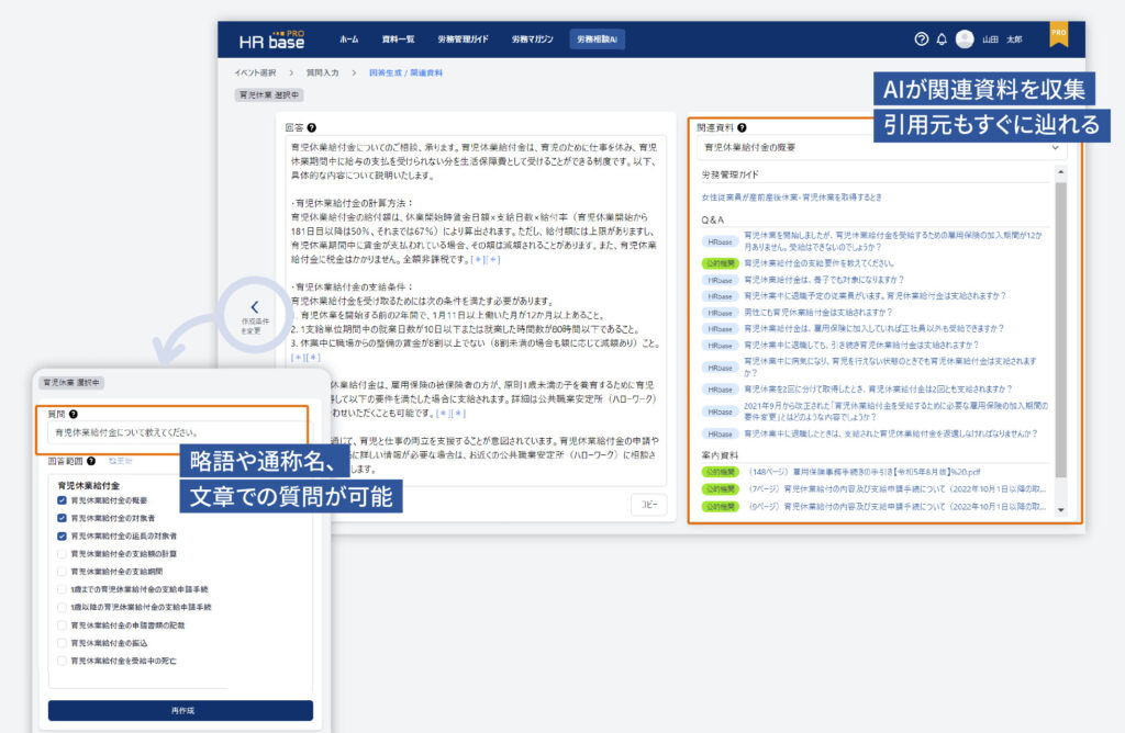労務アシスタントAIでは、AIが資料集めと要約作成をアシストします。