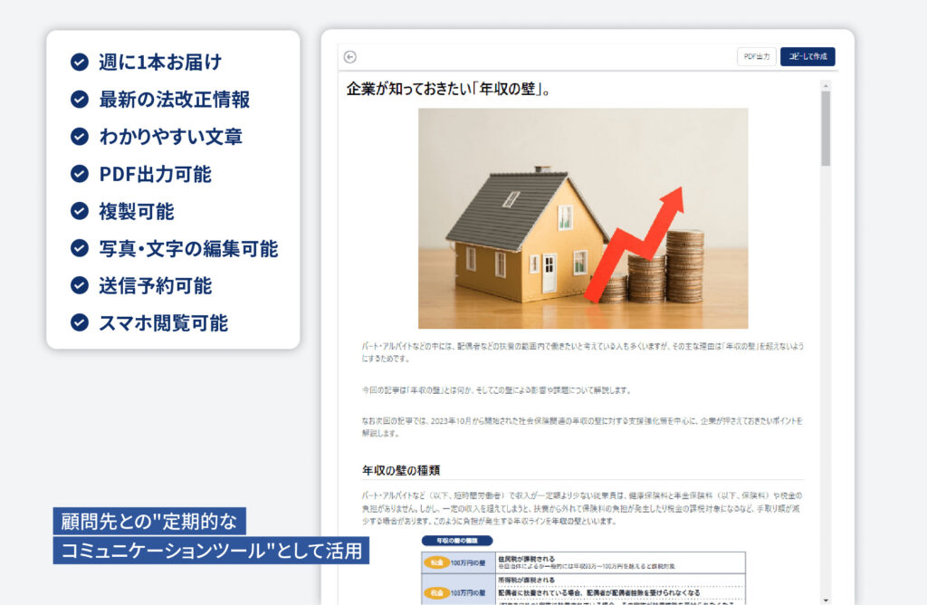 読みやすく要点をまとめたブログ記事を、ニュースレターとして配信できます。顧問先に届けるだけではなく、情報収集や職員の育成にも役立つと評判です。