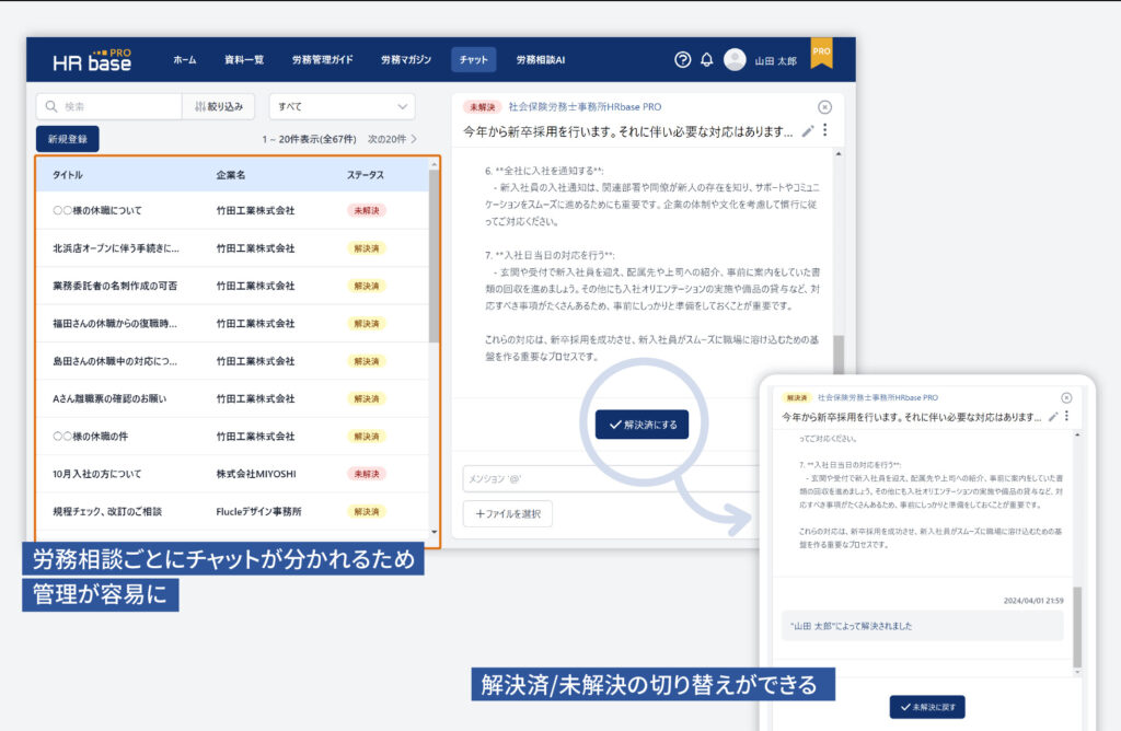 チャット内では、顧問先ごとではなく労務相談ごとに記録が残るため、労務相談の記録を残しやすくなっています。【解決】【未解決】ボタンがあり、タスク管理にも役立ちます。一度解決した案件は、再び未解決に戻すこともできます。
