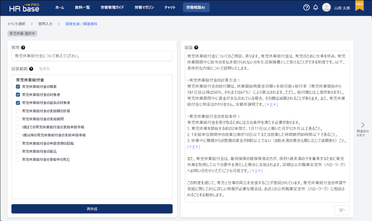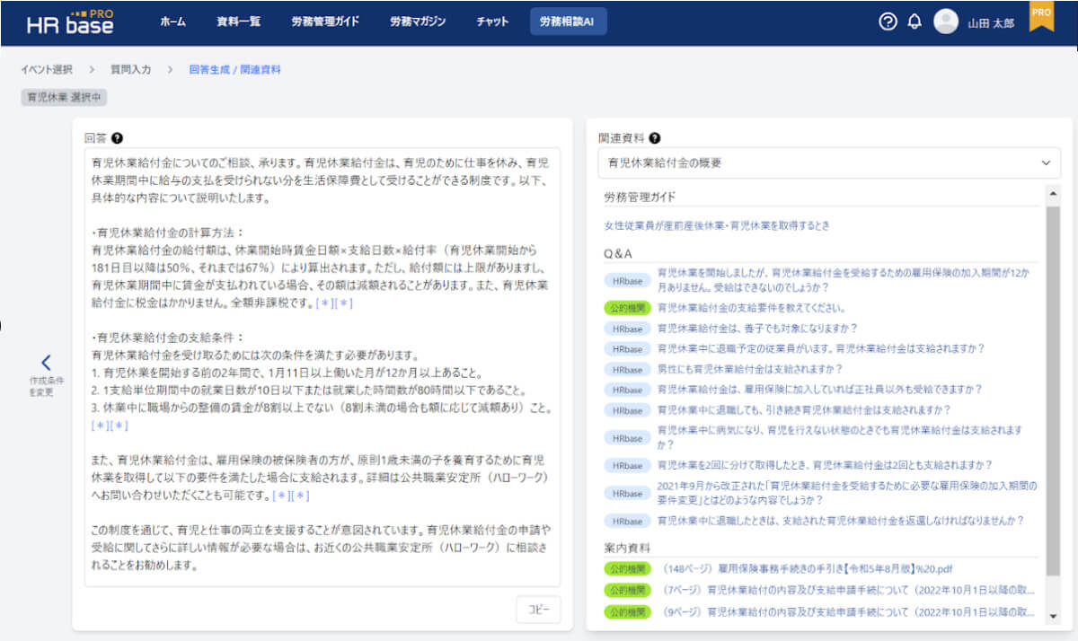 AIには、厚生労働省のリーフレットやリーガルチェックをしたHRbase PROの信頼できる資料を読み込ませています。