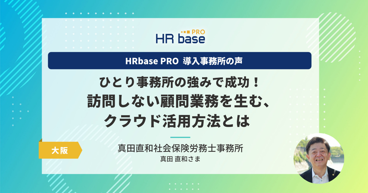 私は大阪市内しか商圏としていないのですが、今後はHRbase PROを使って「訪問しないサービス」を展開していく予定です。先日も茨木市の企業さまから問い合わせをいただき、HRbase PROを活用した「訪問しない顧問契約」が成立しました。