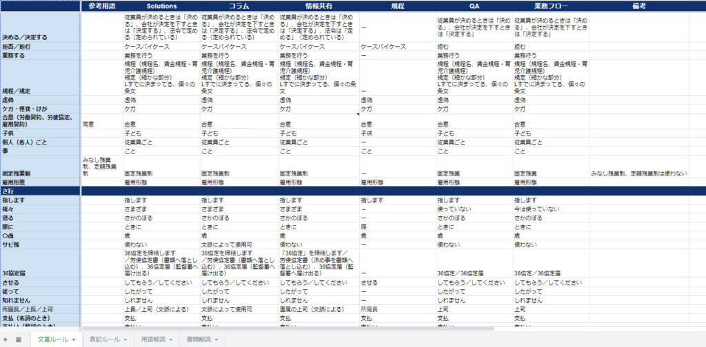 特に労務の現場では、似たような用語が飛び交います。執筆者によって表記が揺れると読者は混乱しますから、混同しやすい言葉、たとえば「従業員代表」と「労働者代表」、「みなし残業制」と「固定残業制」などは明確に使っていい言葉を決めています。