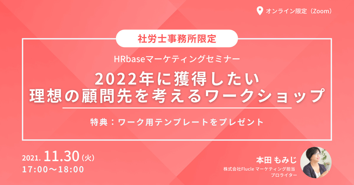 士業事務所限定! HRbase PROのマーケティング担当が、「2022年に獲得したい、理想の顧問先を考えるワークショップ」を開催いたします。アフターコロナの営業戦略としてマーケティングの手法を取り入れようと考える、すべての先生に聞いていただきたいセミナーです。