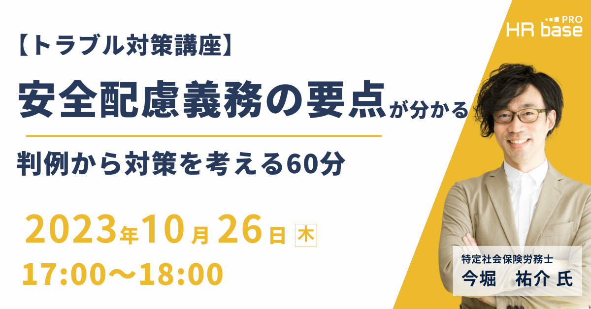 本セミナーでは、法律事務所でパラリーガルとして数々の労使紛争案件に携わった経験をもつ特定社会保険労務士の今堀氏が、安全配慮義務とは何か、その必要性と、実際の判例を元にした対策と体制構築などを解説いたします。顧問社労士として、顧問先が安全配慮義務違反を行う前に対策を講じておきませんか?