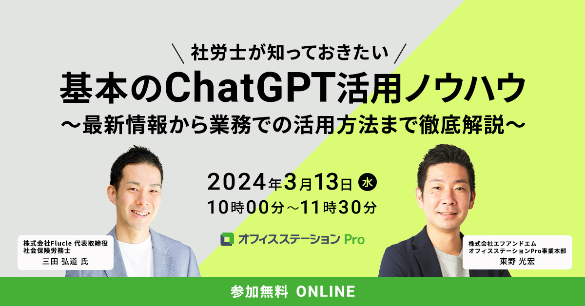 そこで今回は、株式会社Flucle代表で社会保険労務士の三田弘道が、ChatGPTをはじめとする生成AIの概要とその最新情報、業務効率化のための活用方法などを詳しくお話いたします。まだAIを使ったことがない、使いこなせていない社労士の先生必見!ChatGPT活用の基本セミナーです。