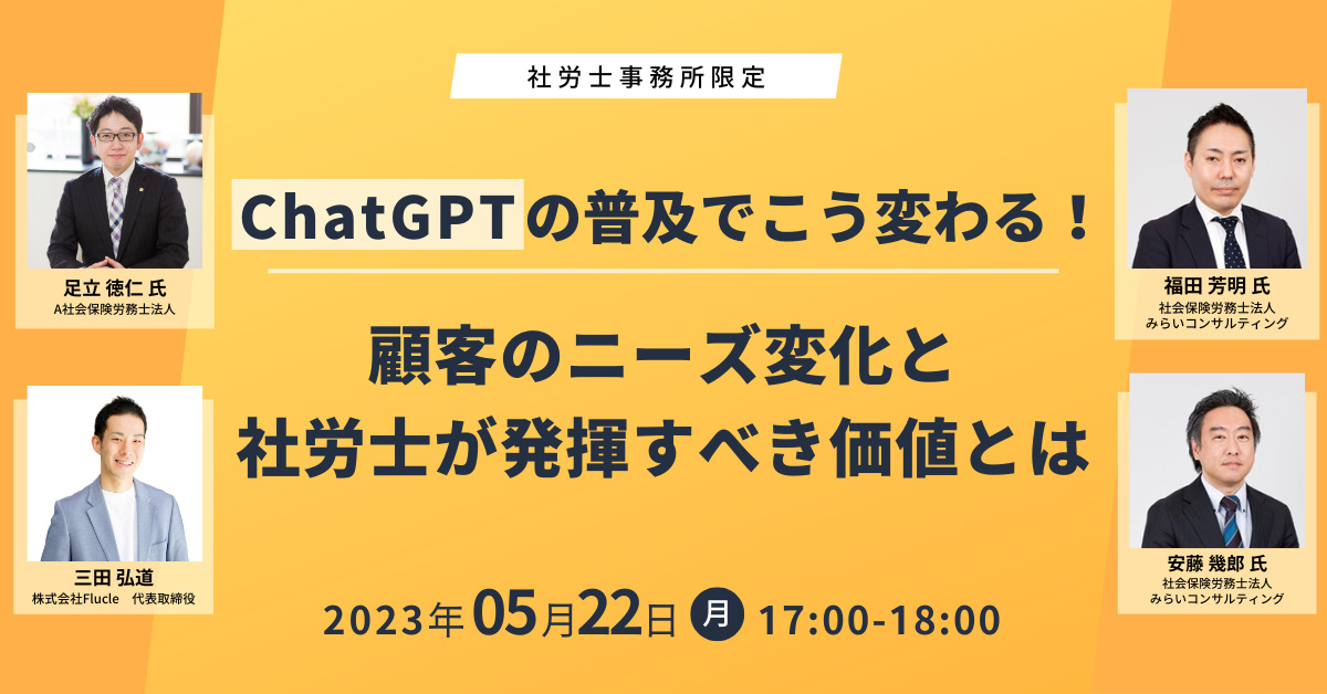 | セミナー名 | ChatGPTの普及でこう変わる!顧客のニーズ変化と社労士が発揮すべき価値とは |