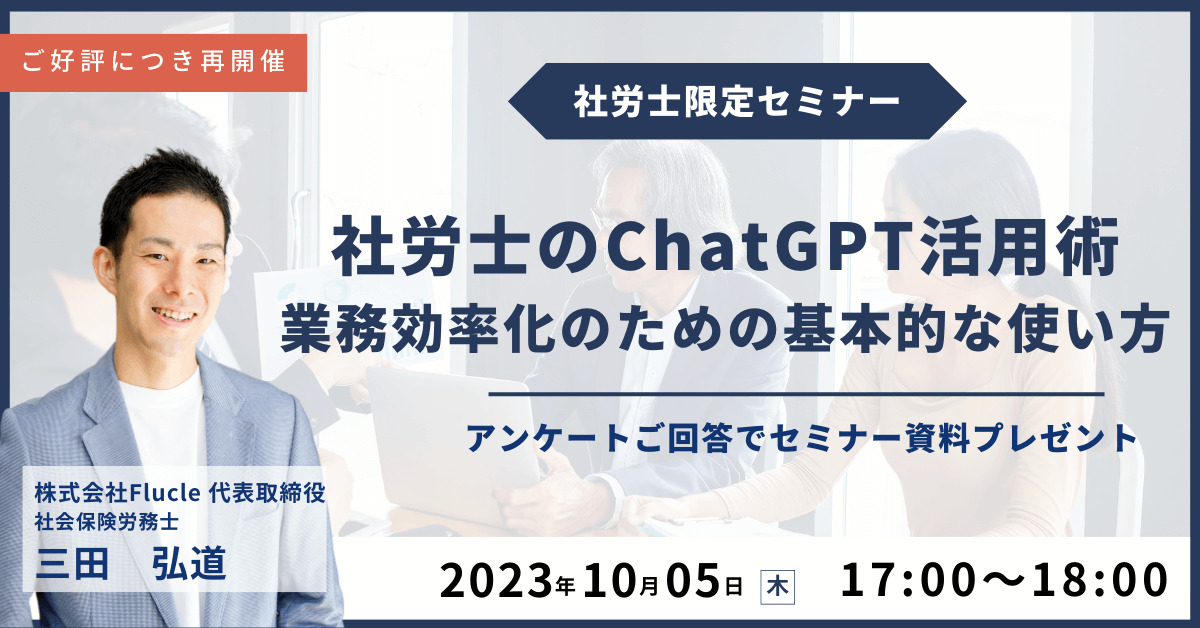 | セミナー名 | ご好評につき再開催!【社労士のChatGPT活用術】業務効率化のための基本的な使い方 |