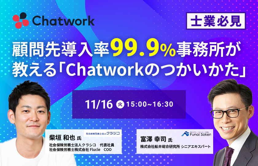 顧問先とのコミュニケーションを、電話やメールからChatworkに切り替えて劇的に効率化した社会保険労務士法人クラシコ。今回は、クラシコの事例をもとに「Chatwork導入率99.9%に引き上げた方法」から「Chatworkで『定期連絡の自動化』を行う方法」まで解説します。また、船井総研さんからは、全国の士業事務所のChatworkの活用事例をお話しいただきます。