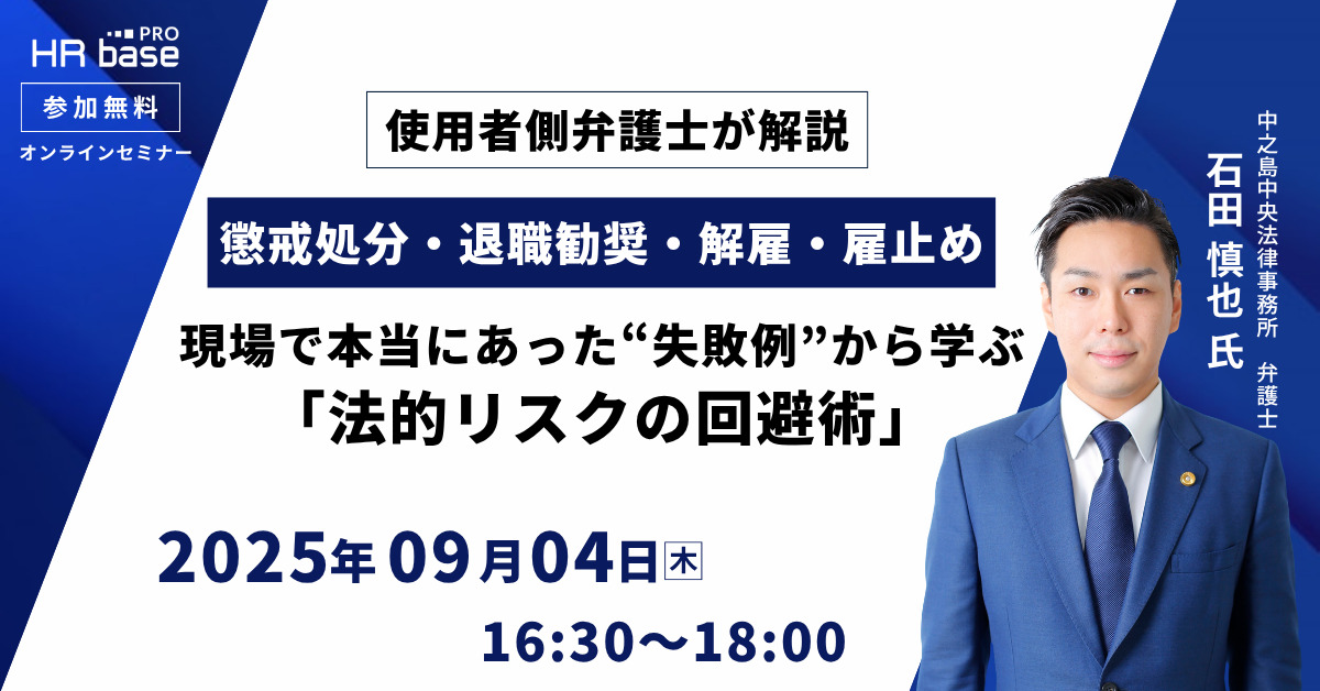 | セミナー名 | 【使用者側弁護士が解説】懲戒処分・退職勧奨・解雇・雇止め、現場で本当にあった“失敗例”から学ぶ「法的リスクの回避術」 |