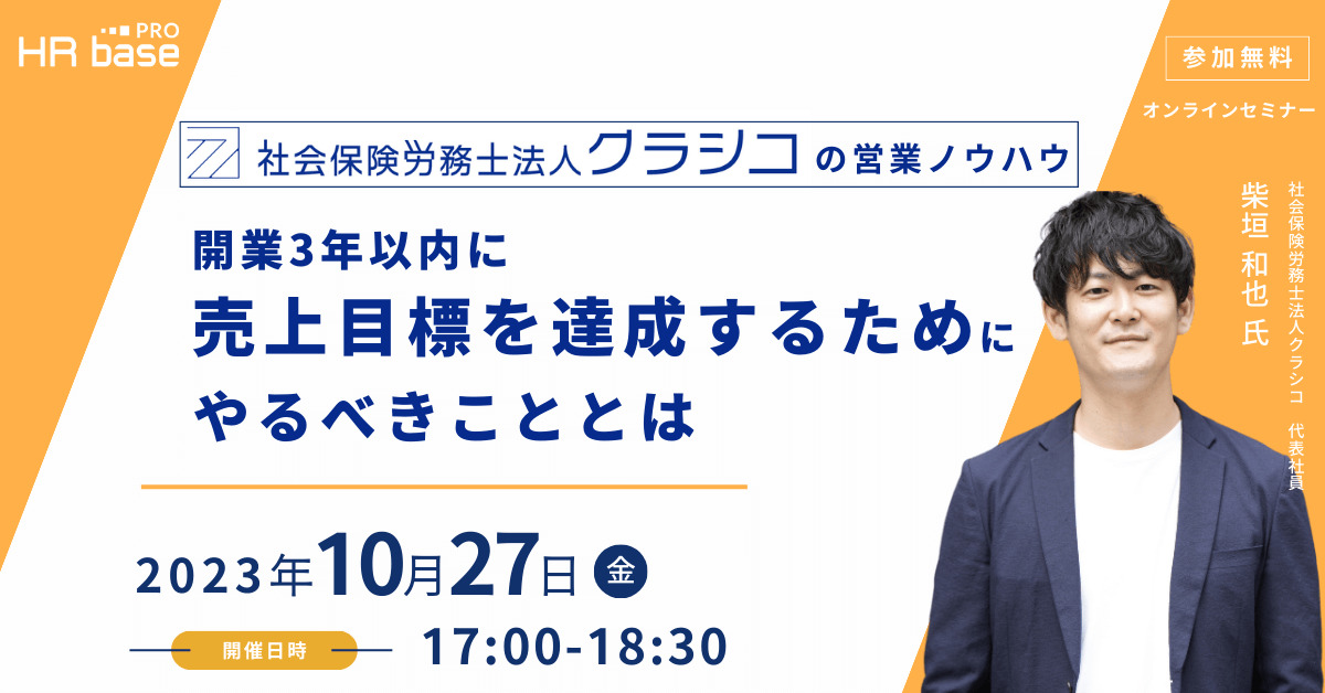 本セミナーには、開業から売上をのばし続ける「社会保険労務士法人クラシコ」の代表柴垣氏が登壇。開業後から今に至るまで、やってきてよかったこと・やらなくてよかったことを中心に、社労士事務所が売上目標を達成するための営業ノウハウを解説いたします。