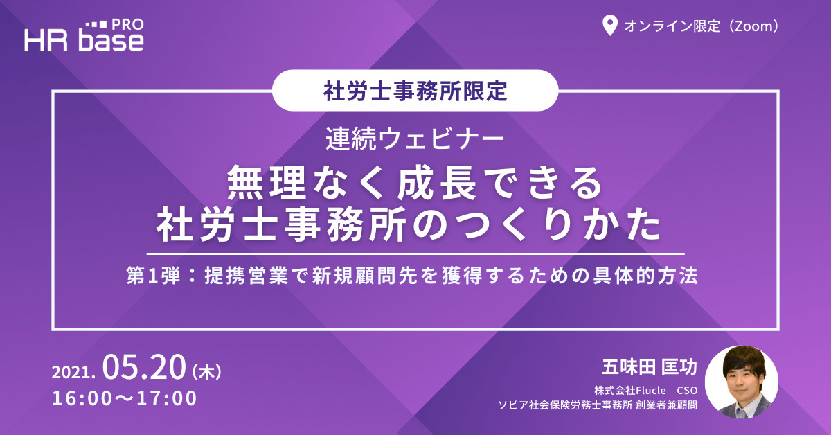 HRbase PROでは、「無理なく成長できる社労士事務所のつくり方」を3回連続のウェビナーとして開催いたします。今回はその第1弾となっております。「社労士事務所の経営は、受け身では成り立たなくなってきている」、そう実感される所長さまは、ぜひご視聴ください。