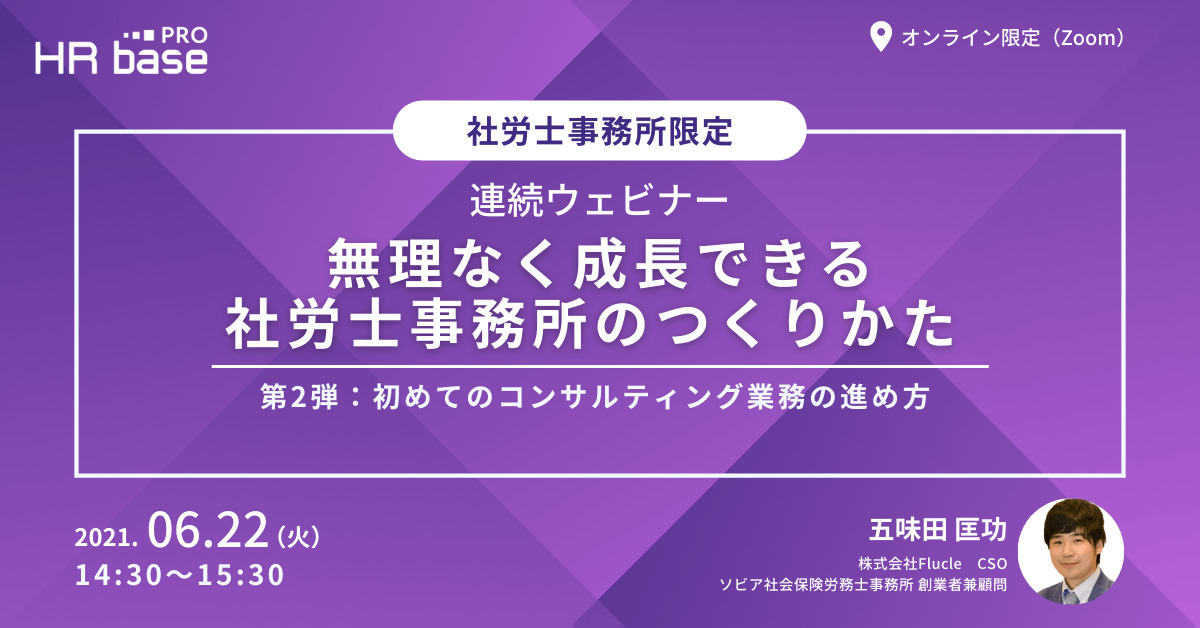 HRbase PROでは、「無理なく成長できる社労士事務所のつくり方」を3回連続のウェビナーとして開催いたします。今回はその第2弾となっております。「これからコンサルティング業務を積極的に行っていきたい」、そうお考えの方は、ぜひご視聴ください。これからの事務所を支える2番手、3番手スタッフとご一緒に視聴いただくこともおすすめです。