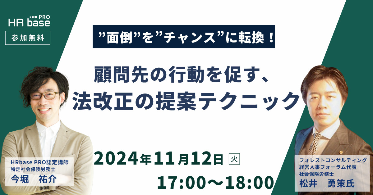 本セミナーでは、2025年の育児介護休業法改正を例に、企業に積極的に取り組んでもらうための具体的な提案方法について解説します。講師は、フォレストコンサルティング経営人事フォーラム代表 松井勇策氏です。またディスカッションパートでは、法律事務所でパラリーガルとして数々の労使紛争案件に携わり特定社会保険労務士の今堀氏が実際の経験をもとに提案のポイントについてお伝えさせていただきます。