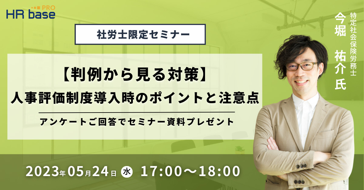 本セミナーでは、法的リスクを軽減して人事評価制度を導入するためのポイントや、策定に必要な要素などを中心に、HRbase PRO認定講師 特定社会保険労務士の今堀祐介氏が解説致します。法律事務所でパラリーガルとして数々の労使紛争案件に携わった経験をもとに、適切な人事評価制度を構築するためのポイントを幅広くお伝えいたします。