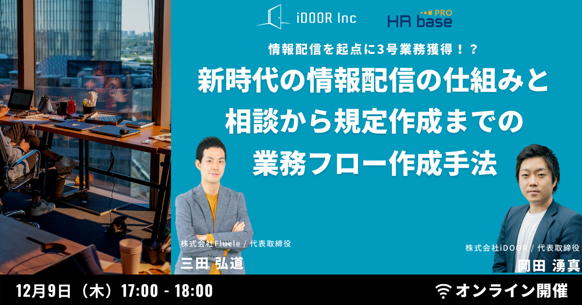 今回は、士業向け動画配信システム「L-Magazine(エルマガジン)」を提供する株式会社iDOOR 代表取締役の岡田湧真さまに、「情報配信」から始まり、「労務相談」や「規程作成業務」を受注するまでの一連の業務フローをどのように作るか、について解説いただきます。