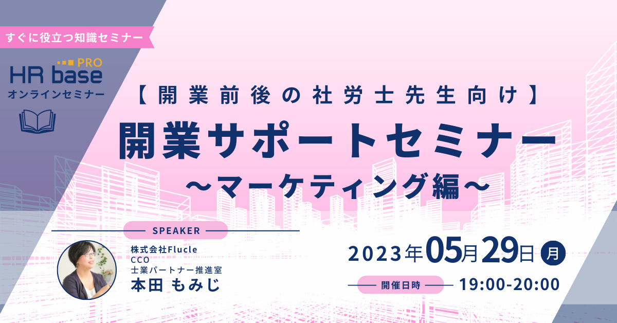 開業後、スピーディーに自分に合った顧問先を獲得するためには、マーケティング思考と具体的な行動が必要不可欠です。多くの先生のマーケティングを支援してきたHRbase PROでは、誰かの成功例を真似するだけでは遠回りになるだけだと考えています。このセミナーでは、士業に必要なマーケティング思考と、何から着手すべきかのヒントを解説いたします。