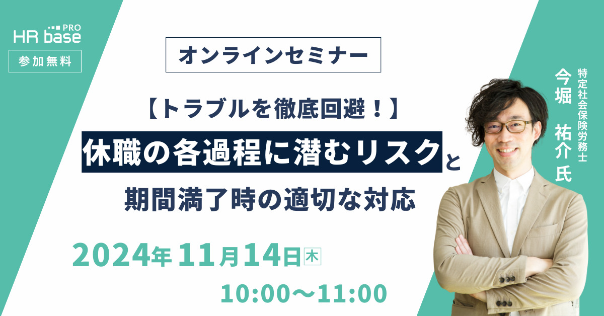 本セミナーでは、就業規則の休職事由の記載、試し勤務とリハビリ勤務、退職の合意など、休職の各過程に潜むリスクと適切な対応を具体的に解説します。講師は、法律事務所でパラリーガルとして数々の労使紛争案件に携わり、トラブル対応をテーマにした多くのセミナーに登壇実績のある、特定社会保険労務士の今堀氏が務めます。