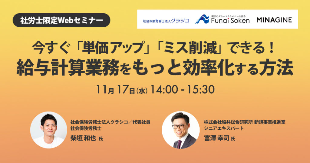 お客様からお預かりした個人情報は、MINAGINE、社会保険労務士法人クラシコ、株式会社船井総合研究所が取得いたします。各社における個人情報の取扱いについては、以下をご確認ください。