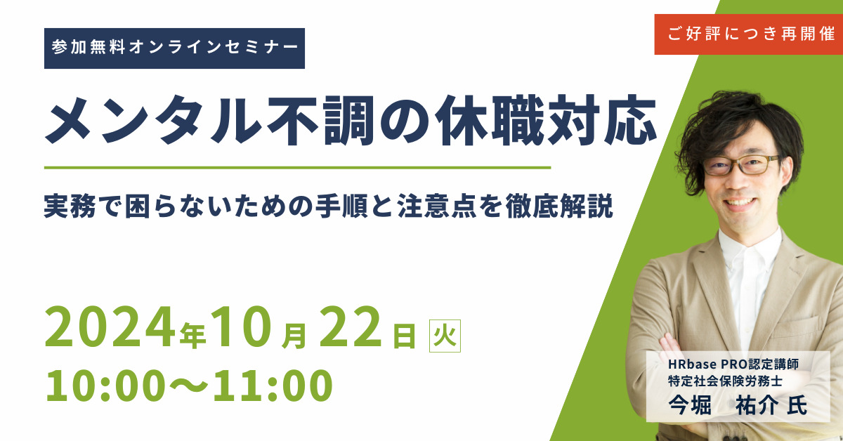 | セミナー名 | 大好評につき再開催!【メンタル不調の休職対応】実務で困らないための手順と注意点を徹底解説 |