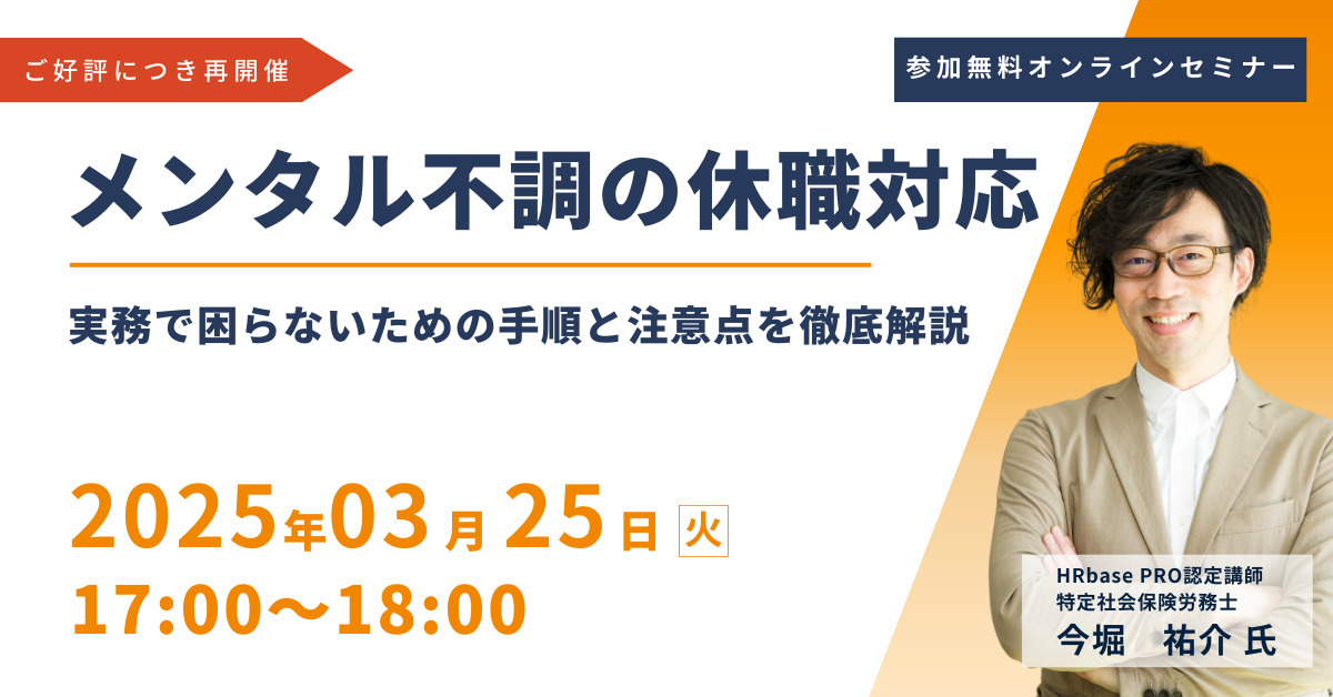 | セミナー名 | 大好評につき再開催!【メンタル不調の休職対応】実務で困らないための手順と注意点を徹底解説 |