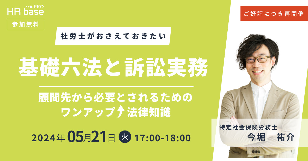 | セミナー名 | ご好評につき再開催!【社労士がおさえておきたい】基礎六法と訴訟実務~顧問先から必要とされるためのワンアップ法律知識~ |