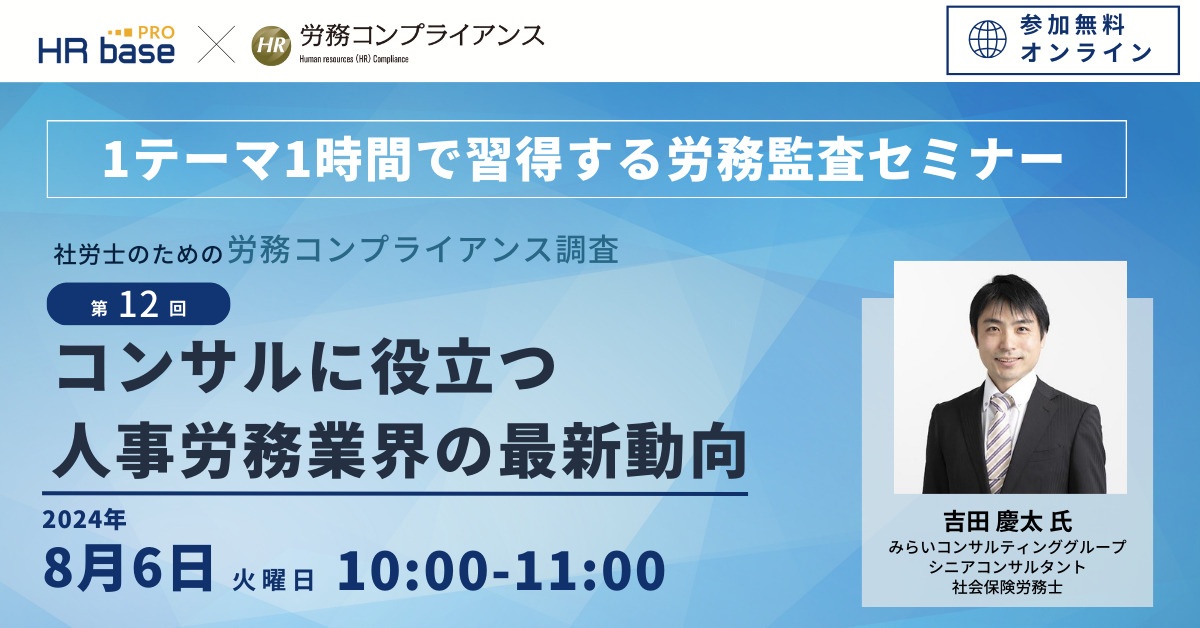 | セミナー名 | 【第12回】1テーマ1時間で習得する労務監査セミナー 社労士のための労務コンプライアンス調査【定期開催】 |