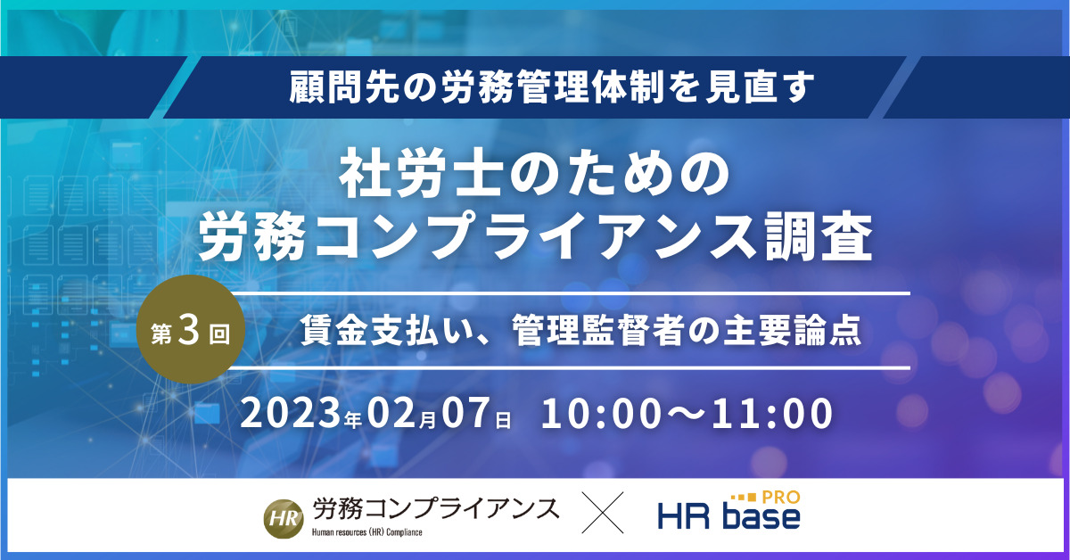 | セミナー名 | 【第3回】顧問先の労務管理体制を見直す 社労士のための労務コンプライアンス調査【定期開催】 |