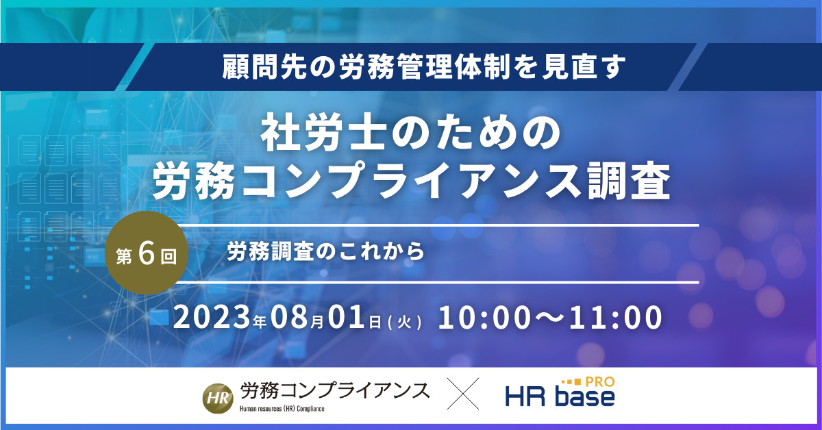 | セミナー名 | 【第6回】顧問先の労務管理体制を見直す 社労士のための労務コンプライアンス調査【定期開催】 |