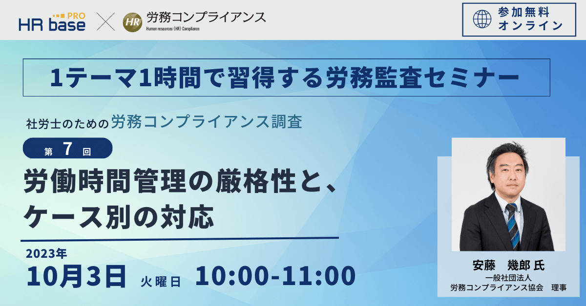 | セミナー名 | 【第7回】1テーマ1時間で習得する労務監査セミナー 社労士のための労務コンプライアンス調査【定期開催】 |