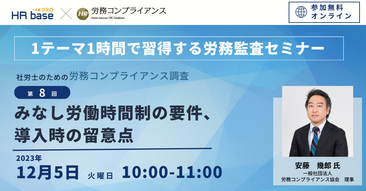 | セミナー名 | 【第8回】1テーマ1時間で習得する労務監査セミナー 社労士のための労務コンプライアンス調査【定期開催】 |