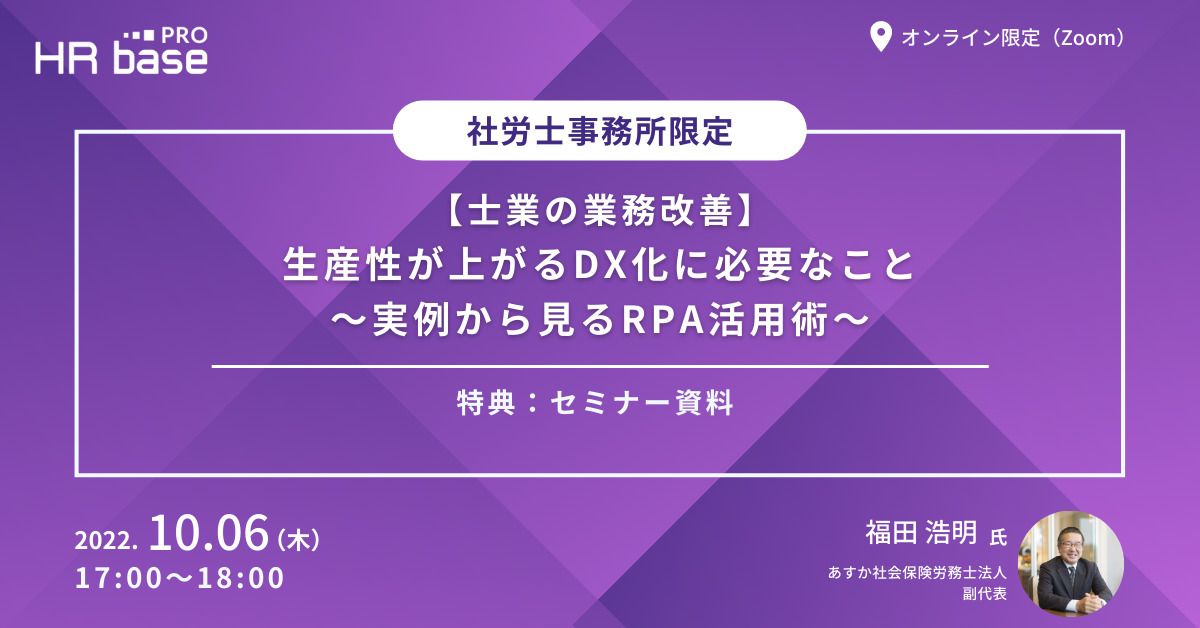 士業向け業務効率化ツールが次々と出てくる中で、どれがどの業務に使えるかよくわからないという先生も多いのではないでしょうか。今回は、定例業務を自動化できる「RPA」に焦点を当て、「RPA」とはどんなものか、「RPA」で何ができるか、なぜ「RPA」が必要なのかを中心にあすか社会保険労務士法人福田浩明氏にお話していただきます。