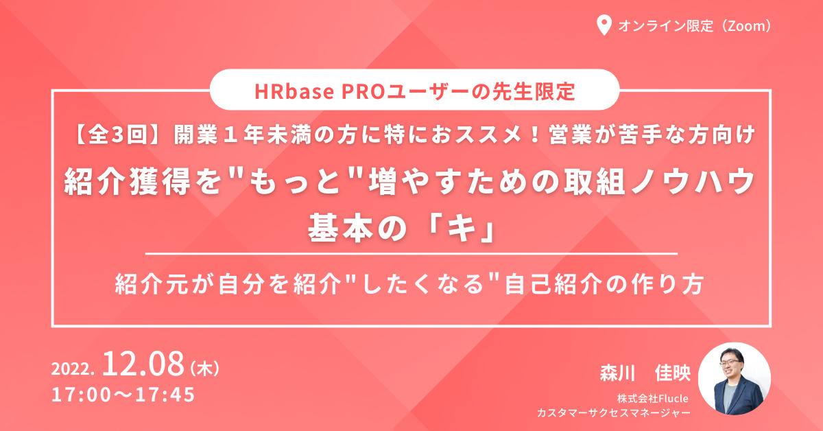 HRbasePROをご利用いただいている先生方限定でのセミナーを開催!今回は「紹介獲得について」をテーマに、全3回でセミナーを実施させていただきます。