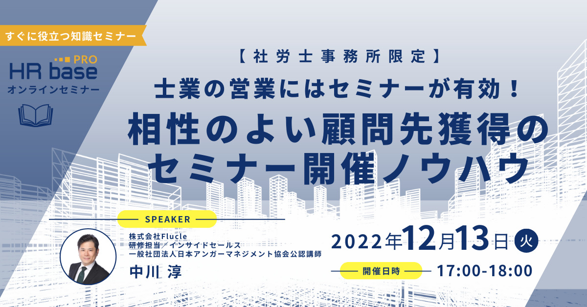 本セミナーでは、「顧問先を開拓するための士業のセミナー」に焦点を当て、顧問先になってほしい企業をセミナーで集客するための手法、セミナー内容の選び方、構成、話法などについて、セミナー講師経験豊富なHRbase PROの中川淳が解説いたします。