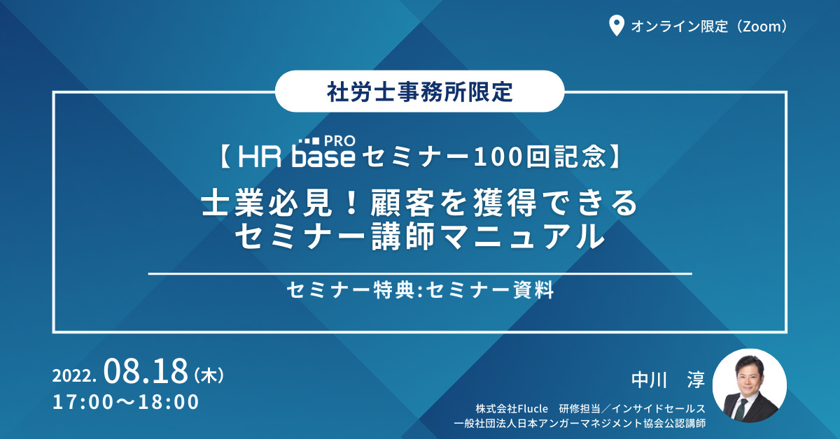 | セミナー名 | 【HRbase PROセミナー100回記念】士業必見!顧客が獲得できるセミナー講師マニュアル |