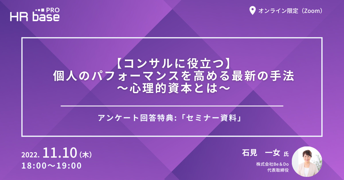本セミナーでは、「心理的資本」とは具体的にどのような概念なのかと、個人のパフォーマンスを高めるために「心理的資本」をどう活用すべきかを、株式会社Be&Do代表石見氏より解説いただきます。