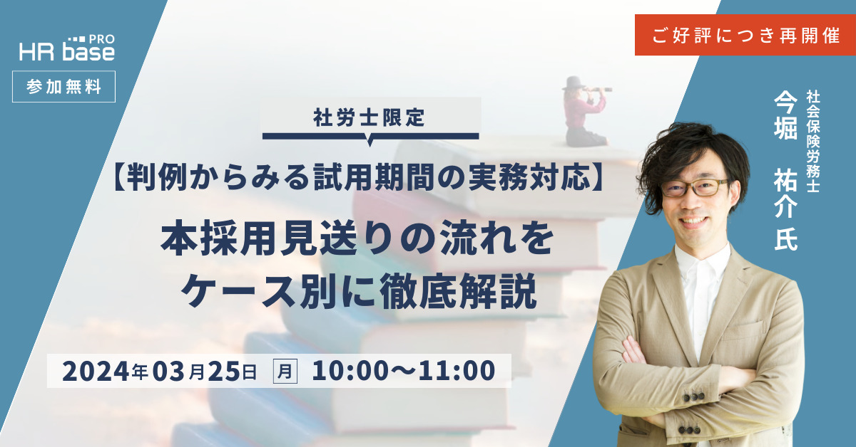 | セミナー名 | ご好評につき再開催!【判例からみる試用期間の実務対応】本採用見送りの流れをケース別に徹底解説 |