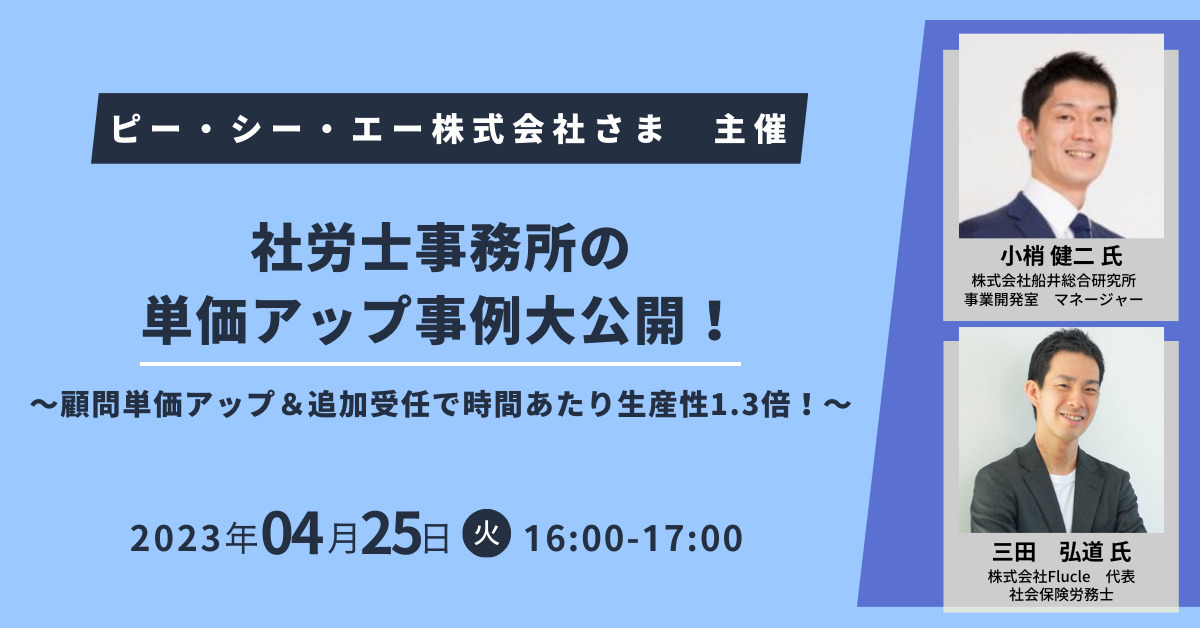 | セミナー名 | 【士業事務所限定】社労士事務所の単価アップ事例大公開!~顧問単価アップ&追加受任で時間あたり生産性1.3倍!~ |