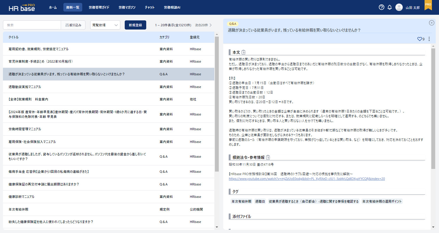 初心者のうちはネットを調べるのにも一苦労でしたが、HRbase PROは根拠法令などの関連情報にすぐに飛べるのがありがたいです。今では検索エンジンと同じように、知りたいことを何でも聞いています。