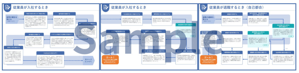 HRbase PROで一番使っているのは、入退社の手続き表です。 手続き自体は特に難しくはないと思うのですが、社長さんの中には労務の話は頭の中でシャットダウンされる方もいらっしゃいますよね。そうなると口頭説明では伝わらないし、メールも「文章が長くてわからない」と言われてしまいます。そんなときこのような図があると非常に助かります。